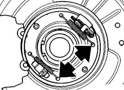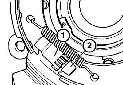 2. Отцепите возвратные пружины от колодок. Проверьте состояние пружин и при необходимости замените их.