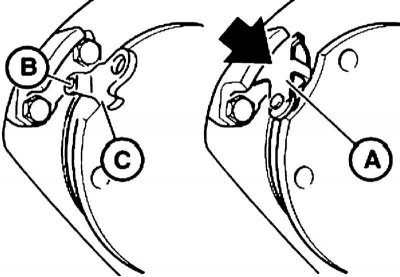 4. При необходимости снятия разжимного механизма снимите деталь (A), потянув ее назад. Выпрессуйте штифт (B) и выньте деталь (C).