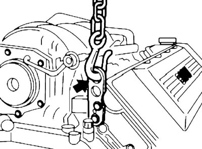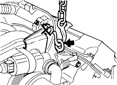 7. Вывесьте двигатель при помощи специального приспособления, используя подъемные проушины двигателя.