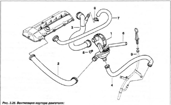 Концентрация углеводородов в картере двигателя может во много раз превышать регистрируемую в ОТ. Система регулирования вентиляции картера (рис. 3.28) двигателя направляет картерные газы во впускной трубопровод, откуда они поступают в камеру сгорания для дожигания.