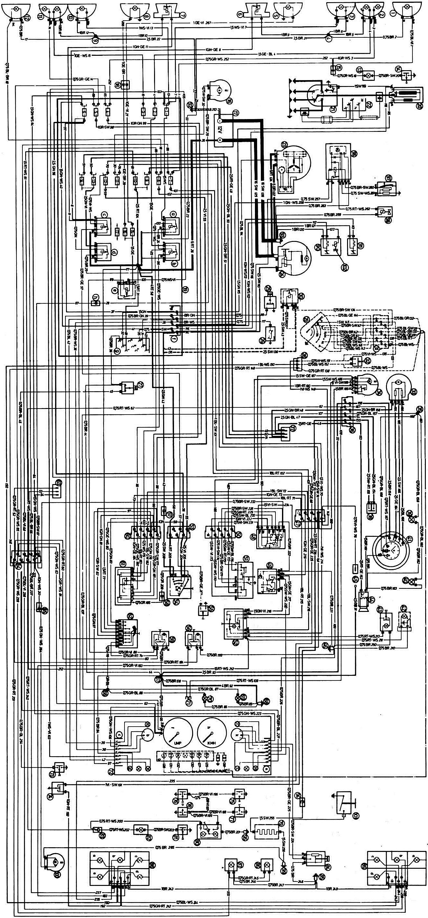 1 - Преден десен мигач; 2 - десен фар за къси светлини със странична крушка; 3 - десен фар за дълги светлини; 4 — до-точка връзки с "маса"; 5 - дясна светлина за мъгла1); 6 - десен звуков сигнал; 7 - ляв рог; 8 - лява светлина за мъгла1), На 9 — до-точка връзки с "маса"; 10 - Ляв фар за дълги светлини; 11 — ляв фар за къси светлини със странична крушка; 12 - Преден ляв мигач; 13 — лампа под капака; 14 — превключвател на лампата под капака; 15 — гнездо за лампа под капака; 16 — двигател за миене на предното стъкло; 17 — батерия; 18 — блок на фара за мъгла; 19 — монтажен блок: а — реле за дълги светлини; b — реле за къси светлини на фаровете; в — реле за включване на звукови сигнали; d — реле на веригата за зареждане на батерията; e — реле за фарове за мъгла; f — съединител на двигателя; g — диагностичен контакт; h — клеми за свързване на двигателя за миене на предното стъкло; 20 — бобина за запалване; 21 — разпределител на запалването; 22 - гнездо за свързване на тестер с проводник и сензор; 23 - генератор; 24 — стартер; 25 — сензор за предупредителна светлина за налягането на маслото; 26 — сензор за измерване на температурата на охлаждащата течност; 27 — превключвател на индикаторната лампа за нивото на спирачната течност; 28 — превключвател за превключване на скоростите с индикатор за предавките2); 30 — реле на стартера2); 31 — съединител на превключвателя на скоростната кутия2); 32 - Превключвател на светлините за заден ход; 33 — електрически двигател на вентилатора на нагревателя; 34 - Мотор на чистачките на предното стъкло; 35 - точка на запояване "58b"; 36 — конектор на централната конзола; 37 — клеми за свързване на електрически двигатели за повдигачи на прозорци, антена и люк; 38 — ключ за отопление на задното стъкло; 39,40 — лампи за осветление на превключвателя за управление на нагревателя; 41 — превключвател за управление на нагревателя: а — опция с часовник; b — опция с подсветка на часовника; 42 — лампа за осветяване на картата1); 43 — лампа за осветление на жабката; 44 — запалка; 45 - радиоприемник; 46 — до-точка връзки с "маса"; 47 — конектор; 48 — Реле за чистачки на предното стъкло; 49 — мигащо реле за пътепоказатели и аварийни светлини; 50 — Съединител на превключвателя на чистачките на предното стъкло; 51 - Превключвател на чистачките на предното стъкло; 52 — ключ за предупреждение за опасност; 53 — съединител на ключа за запалване; 54 - ключ за запалване; 55 - Превключвател за звуков сигнал; 56 — Превключвател на задните фарове за мъгла; 57 — контакт "50" на устройството против кражба; 58 — контакт "P" на ключа за запалване; 59 - Превключвател за фарове за мъгла; 60 — конектор за мигач и ключ за фарове; 61 — пътепоказател и превключвател на фаровете; 62 - Ключ за външно осветление; 63 - контакт с три щепсела; 64 — конектор "1"; 65 — клеми за свързване на горивната електрическа помпа; 66 - точка на запояване "58b"; 67 - точка на запояване "31"; 68 — до-точка връзки с "маса"; 69 - осветителна лампа "1"; 70 - осветителна лампа "2"; 71 — терминал за свързване на часовника; 72 — арматурно табло: а — предупредителна лампа за налягането на маслото; б — индикатор за температурата на охлаждащата течност; c — съединител; d — контролна лампа (син цвят) включване на дълги светлини; д — контролна лампа (червен цвят) заряд на батерията; f — тахометър; g — индикатор за предавка KP2): "P" — бяла контролна лампа; "R" — червен светлинен индикатор; "O" - бяла контролна лампа; "
